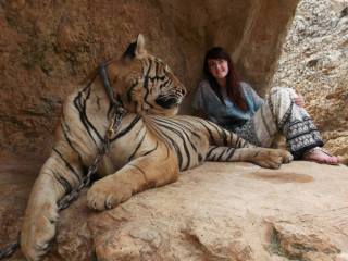 For my tiger experience I visited Tiger Temple in Kanchanaburi, which is around 2 and a half hours from Bangkok. The temple is run by monks, volunteers and local Thai staff who raise and look after the tigers. I got chatting to one American volunteer, who had been working at the temple for just over four months, and she explained how the temple was run and how the tigers were raised and treated. She was adamant that the tigers were not drugged, emphasising that monks do not believe in interfering with nature and lifecycles. Instead, the tigers were calm and able to interact with tourists for a number of other reasons. All the tigers in Tiger Temple were hand raised from birth in captivity, and as a result were used to regular human contact. Furthermore, the tigers were fed more regularly than they would in the wild, slowing down their metabolism and making them more placid. It was reassuring to know that the tigers weren’t being mistreated for the sole purpose of tourism, an industry that I was directly funding by even visiting Tiger Temple. However, if the word of this young volunteer wasn’t enough, tourists could later watch the tigers playing, eating and interacting with each other in their enclosure, firmly putting to bed any niggling doubt that the tigers were being drugged for tourist purposes.