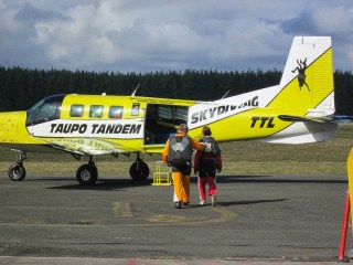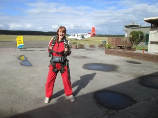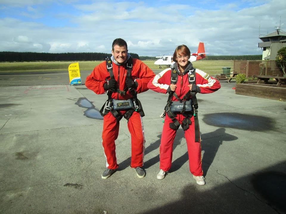 We had spent a couple of days in Lake Taupo and 3 of us had decided that this is where we wanted to do our skydive. So on our final day we headed off to the airfield on the outskirts of town and luckily enough the weather was perfect. Sadly, we had been out the night before and I was seriously suffering with a hangover. I wasn’t going to let a little bit of a sicky stomach put me off though. I handed over my £125 (bargain, if you ask me) and got suited and booted in a rather attractive red jumpsuit. We watched a short training video, had a quick talk from one of the professionals and then we were buddied up with our professional. Just before we got on the plane, I had to rush to the loo for a quick hangover vom sesh and was ready and raring to go.